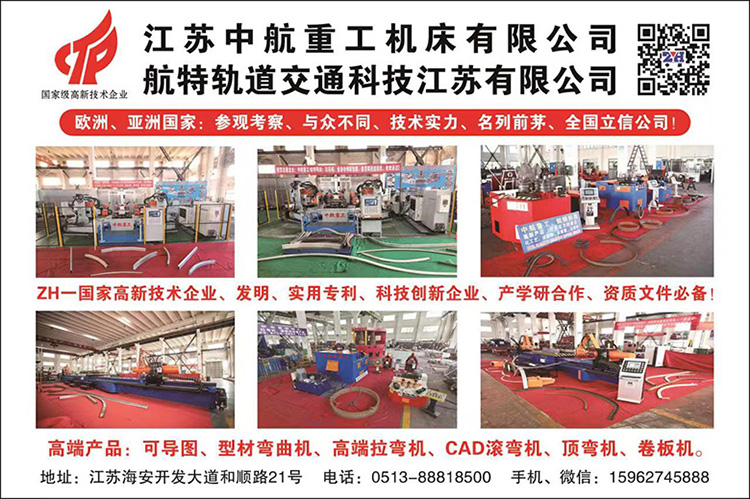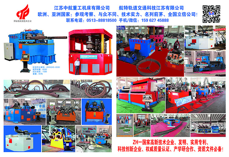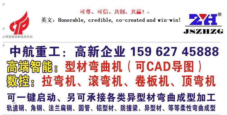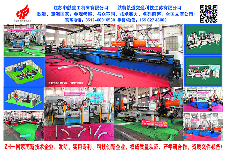 公司簡(jiǎn)介:(國(guó)家高新技術(shù)企業(yè)) 守正創(chuàng)新、自信自強(qiáng) Company Profile: (National High-tech Enterprise) 江蘇中航重工機(jī)床有限公司、航特軌道交通科技江蘇有限公司: Jiangsu ZH Heavy Industry Machine Tool Co., Ltd. HANGTE Rail Transit Technology Jiangsu Co., Ltd. 一、致力于高新產(chǎn)品研究與開發(fā)(原國(guó)家依賴進(jìn)口的專用設(shè)備):伺服數(shù)控、數(shù)顯:三軸、四軸型材彎曲機(jī)(可CAD導(dǎo)圖)、法蘭機(jī)、全自動(dòng)伺服數(shù)控型材拉彎?rùn)C(jī)(可抽芯),、三維數(shù)控拉彎?rùn)C(jī)、頂彎?rùn)C(jī)、CAD伺服數(shù)控彎弧機(jī)(滾彎?rùn)C(jī)) 智能數(shù)控三、四輥卷板機(jī)、專用頂彎?rùn)C(jī)、 (原國(guó)家依賴進(jìn)口的專用設(shè)備、高尖端拉彎、彎曲中航重工升級(jí)創(chuàng)新研發(fā)成功) 英文:Committed to the research and development of high-tech products (the original country relied on imported special equipment): servo CNC, digital display: three-axis, four-axis profile bending machine (CAD map available), flange machine, fully automatic servo CNC profile Bending machine (core pulling), top bending machine, CAD servo CNC arc bending machine (roll bending machine), intelligent CNC three-roller, four-roller plate bending machine, special top bending machine, (The original country relied on imported special equipment, high-end bending, and bending, and ZH upgraded and innovated successfully.)) 二、公司擁有國(guó)內(nèi)型材彎曲成型鍛壓設(shè)備制造專家、航空軌道結(jié)構(gòu)件成型制造國(guó)家特聘專家、(國(guó)家千人教授之一)支持與合作。擁有科技企業(yè)、榮獲國(guó)家高新技術(shù)企業(yè)、多項(xiàng)發(fā)明實(shí)用專利。小巨人企業(yè)、、質(zhì)量認(rèn)證、等必備資質(zhì)。得到國(guó)內(nèi)權(quán)威專家、媒體網(wǎng)絡(luò)、發(fā)表論文、重大突破電視臺(tái)的專業(yè)報(bào)導(dǎo)、其高新專用設(shè)備創(chuàng)新、國(guó)內(nèi)名列前茅、雄厚技術(shù)實(shí)力的象征! 上海交大、合肥工大航空結(jié)構(gòu)件:產(chǎn)學(xué)研合作! 英文:The company has domestic profile bending forming and forging equipment manufacturing experts, national specially-appointed experts in the forming and manufacturing of aviation rail structural parts, and (one of the national thousand professors) support and cooperation. It has a technology enterprise, won the national high-tech enterprise, and has a number of practical patents for inventions. Small giant enterprise, , quality certification, and other necessary qualifications. It is a symbol of domestic authoritative experts, media networks, published papers, professional reports of major breakthrough TV stations, innovation of its high-tech special equipment, top domestic rankings, and strong technical strength! Shanghai Jiaotong University, Hefei University of Technology Aeronautical Structural Parts: Industry-University-Research Cooperation Base 三、適用領(lǐng)域:各類壓力容器、鋼結(jié)構(gòu)、汽車、航天、航空、動(dòng)車、電梯、高速公路、軌道交通、橋梁工程、體育館異形、彎曲造型、等板材成型加工、彎曲成型、結(jié)構(gòu)件制造行業(yè)、非標(biāo)定制、產(chǎn)品覆蓋國(guó)內(nèi)、遠(yuǎn)銷海外市場(chǎng)、深受客戶好評(píng)!為異形彎曲成型設(shè)備、做出了貢獻(xiàn)!
