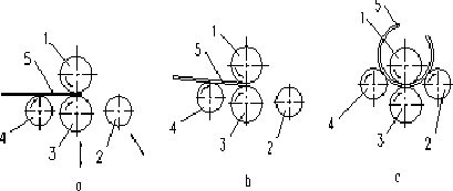 工作時(shí),將被彎卷板料的前端放至上、下輥 1、3 之間,并對中找正(對中時(shí)升起側(cè)輥 2,將鋼板 5 對齊側(cè)輥 2 的側(cè)母線)。升起下輥 3,并將板料壓緊,如圖 3.4(a)所示。然后升起側(cè)輥 4,從而使板料端部彎曲,如圖 3.4(b)所示。啟動后,輥 1、3、4 便構(gòu)成一非對稱式三輥卷板機(jī),因而板料彎卷后在其后端仍有一小段平直部分不能被彎曲。若再將側(cè)輥 2 升起,如圖 3.4(c)所示,則輥 1、2、4 就構(gòu)成一對稱式三輥卷板機(jī), 因此板料不需從機(jī)器上取下就能將其全部彎卷。